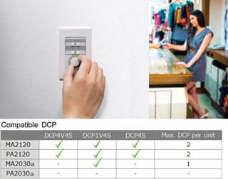 * DCP4V4S, DCP1V4S e DCP4S, até duas unidades no total, podem ser conectadas ao MA2120 e PA2120. Uma unidade de DCP1V4S pode ser conectada ao MA2030a.