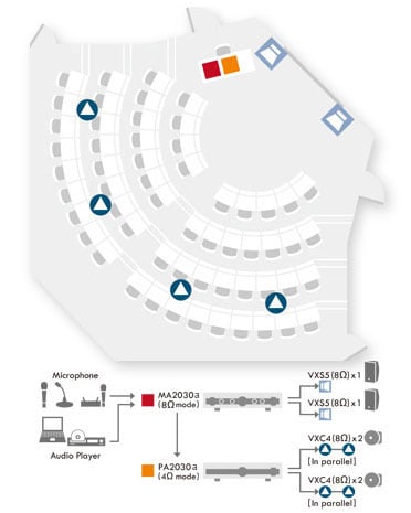 Este sistema é adequado para auditórios, salas de conferência. Um MA2030a é usado no modo 8Ω e um PA2030a é usado no modo 4Ω, conduzindo um par de alto falantes de montagem de superfície VXS5 (8Ω cada) e quatro alto falantes de teto VXC4 (8Ω cada), respectivamente. Múltiplos microfones podem ser conectados ao MA2030a e o nível geral de saída na sala pode ser facilmente controlado através do botão de volume do painel frontal.