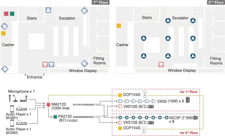 Esta figura mostra um sistema de uma loja de vestuário com dois andares, exigindo música diferente em diferentes níveis de saída em cada andar. O MA2120 está configurado para dirigir linhas de 100 volts, alimentando um total de 6 alto falantes de montagem VXS5 para o 1º andar e 8 altifalantes de teto VXC5F para o 2º andar. O PA2120 adicional conduz um subwoofer VXS10S para cada andar, proporcionando graves mais adequados à música. Os painéis do controlador DCP1V4S permitem o controle de volume de cada andar, bem como a troca de ligar/desligar do microfone para anúncios da loja.