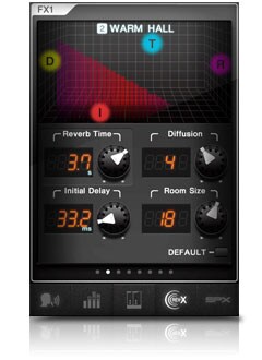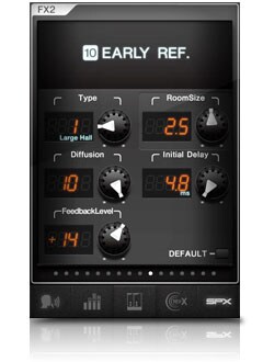 O REV-X tem oito programas diferentes que você pode navegar e selecionar facilmente ao passar pelas páginas. O "Tempo de reverberação", bem como os parâmetros adicionais "Difusão", "Delay inicial" e "Tamanho da sala" podem ser ajustados para cada programa de efeito usando os knobs dedicados ou a exibição gráfica da interface do MGP Editor.
