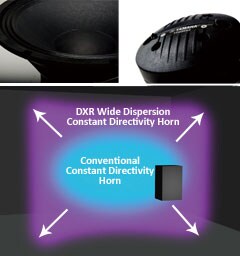 Corneta de diretividade constante com ampla dispersão: O transdutor de AF ficou maior e, montado na novíssima corneta de diretividade constante de 90° por 60°, minimiza a deterioração padrão da radiação em direções oblíquas, comum entre as cornetas mais convencionais. O resultado é uma área de cobertura sem irregularidades. Com a nova corneta o som se expande num padrão retangular de 90° por 60 ° (vertical e horizontal), aproveitando melhor as frequências do som direto.