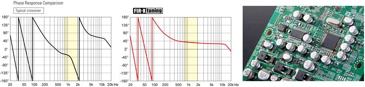 Todos os modelos full range vêm com o FIR-X tuning™ exclusivo da Yamaha, que utiliza filtros FIR* de fase linear na rede crossover. O recurso FIR-X™ otimiza simultaneamente a resposta de frequência e de fase, alinhando o tempo entre os transdutores de frequências agudas e graves. Isso cria uma resposta bastante suave ao redor do ponto de crossover, proporcionando nitidez e imagem muito melhores do que é possível nos crossovers convencionais.