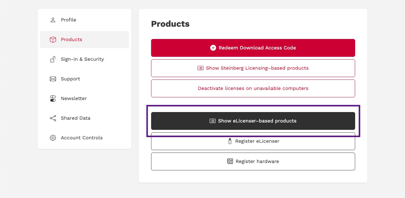 Clique em "Produtos" no painel de navegação à esquerda para verificar se a sua licença do VST Rack Pro está registrada.