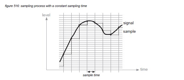 The process of sampling an audio signal every sample interval is visualised in figure 505: the waveform of the audio signal is chopped into discrete samples with a high sample rate (figure 505a) and a low sample rate (figure 505b). It can be assumed that for high frequencies to be reproduced by a sampling system, a high sample rate has to be used. However, a high sample rate implicates that electronic circuits have to be designed to operate with high frequencies, the data transfer and DSP involve a high data rate (bandwidth), and storage requires a high storage capacity. For efficiency reasons, it is necessary to determine exactly how high a sampling rate must be to capture a certain frequency bandwidth of an audio signal, without too much costs for the design of electronic circuits, digital transport, DSP and storage.