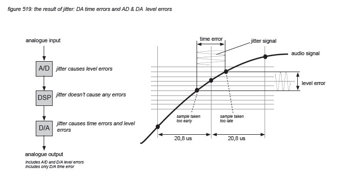 Jitter in a device’s word clock is not a problem if the device only performs digital processes - a MAC operation in a DSP core performed a little earlier or later than scheduled gives exactly the same result. In digital audio systems, jitter only causes problems with A/D and D/A conversion. Figure 519 shows that a sample being taken too early or too late: the jitter timing error - results in the wrong value: the jitter level error. As time information is ignored by the DSP processes and distribution of a digital audio system, only the level errors of an A/D converter are passed to the system’s processes. At D/A converters however, samples being output too early or too late distort the audio signal in level and in timing. The listener to the system hears both A/D and D/A converter jitter level errors, but only the D/A converter’s timing error.