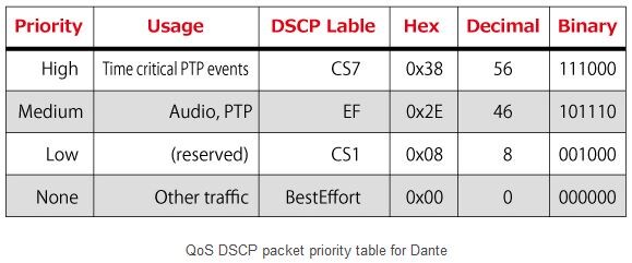 The QoS settings recommended by Dante are listed on the Audinate website.