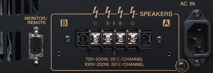 Using 100V speaker distribution to drive BGM zones saves costs. However, because any voltage higher then 50V is susceptible to the EU ‘low voltage directive’ (code 2014/35/EU), 100V systems need additional precautions for connectors and cabling. This is the reason why a 100V power amplifier output terminal has a plastic cover, so users can never touch it by accident. Although the EU directive is called ‘low voltage’, a marking is mandatory to indicate a dangerously high voltage - in many cases lightning icons are used. This isn’t unique to ‘100V’ systems; in the EU it is mandatory for any power amplifier output capable of delivering an output over 50V, or 313 watts to 8Ω, to have the protection cover and markings.