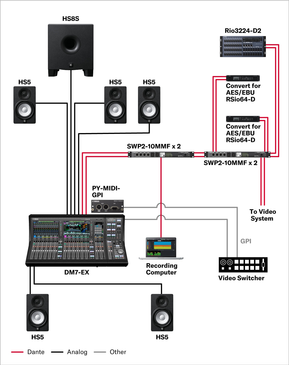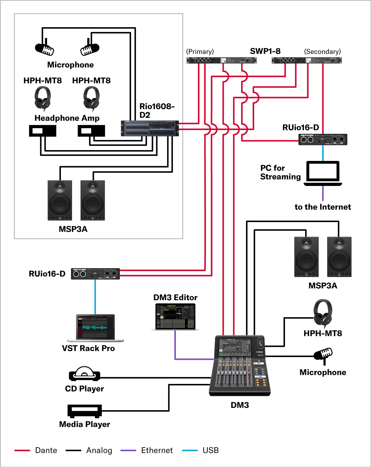 Este é um estúdio usado principalmente para gravação e transmissão de talk shows, como um estúdio de rádio. O mixer digital compacto DM3 é equipado com muitas entradas e saídas. Você pode construir um sistema flexível e escalável centrado no DM3 conectando-o aos equipamentos ao redor via rede de áudio Dante.