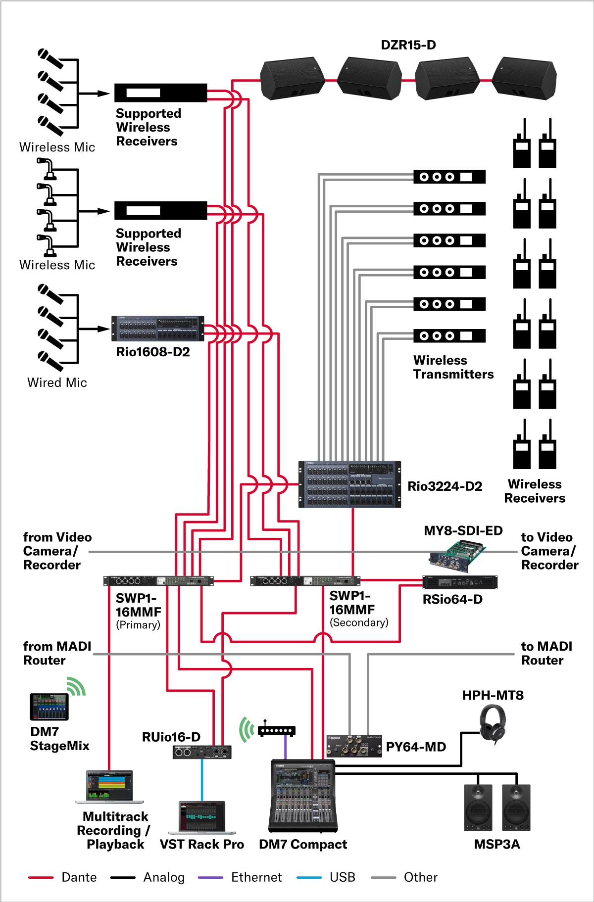 Outra razão pela qual as pessoas escolhem o equipamento de áudio da Yamaha é sua interconectividade com diferentes tipos de redes de áudio, MADI e AES/EBU. Nossos mixers digitais e processadores são equipados com placas de E/S para facilitar a conexão com diferentes formatos. O equipamento Yamaha também se integra perfeitamente aos sistemas existentes. Nossos mixers digitais podem ser usados para monitorar e controlar microfones sem fio feitos por outras empresas como Shure, Sennheiser e Sony. Outra vantagem de nossos mixers é sua excelente capacidade de expansão do sistema e facilidade de uso.