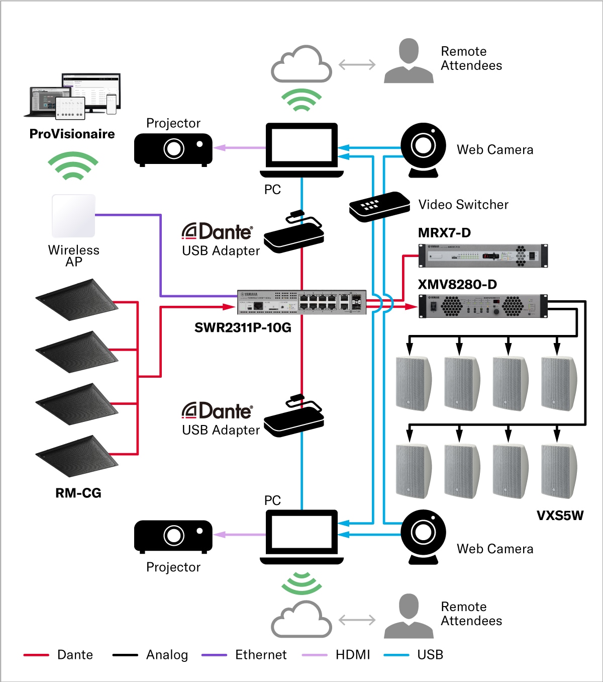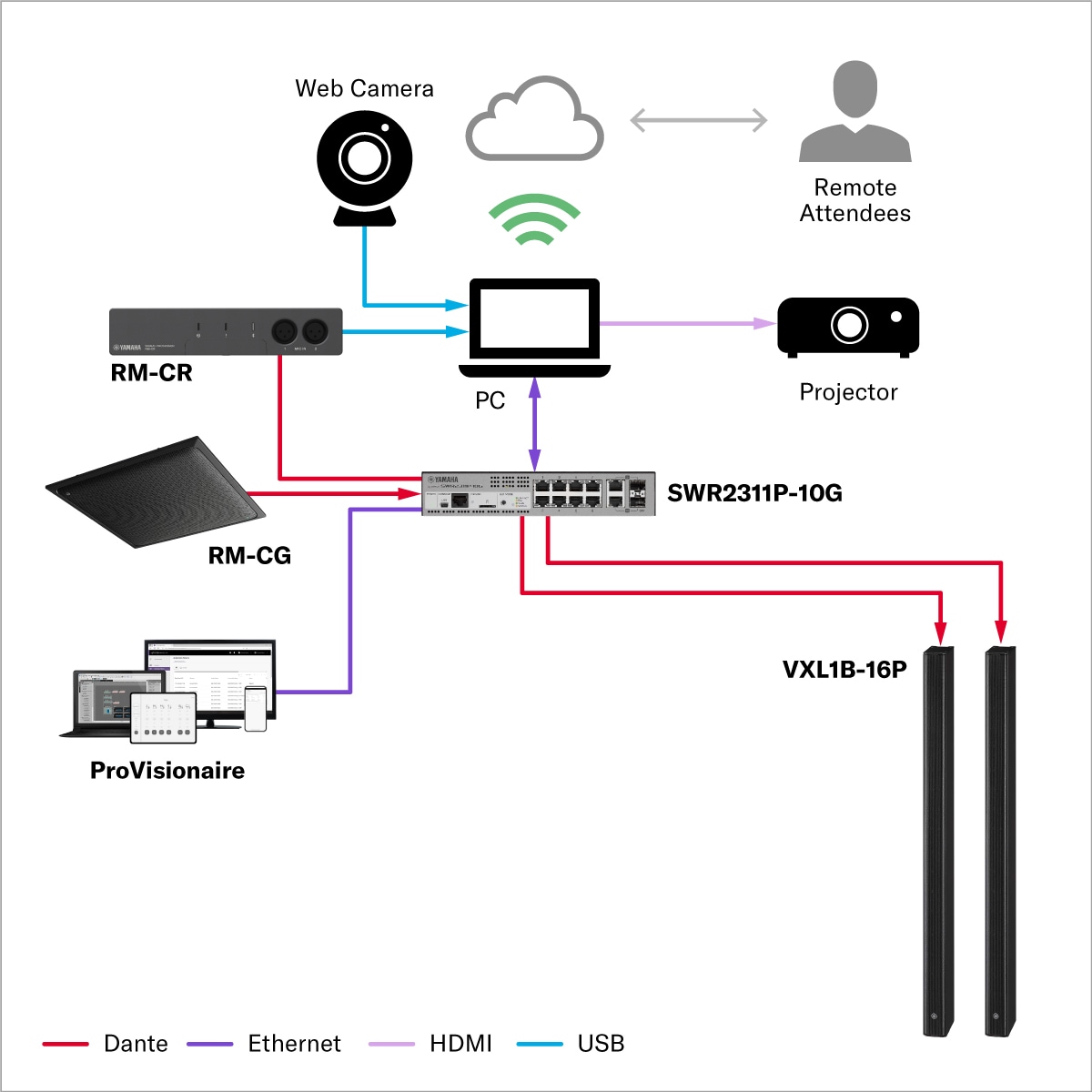 A Yamaha desenvolveu várias funções de processamento de sinal ideais para aplicações relacionadas à voz, como o Acoustic Echo Canceller (AEC), que suprime automaticamente o feedback que pode interferir nas reuniões, e o Auto Mixer, que ajusta automaticamente o volume de vários caixas acústicas e elimina ruídos indesejados. Nosso software dedicado ProVisionaire também pode ajudar os usuários a minimizar problemas relacionados à fala por meio do controle remoto dos parâmetros e da configuração do sistema.