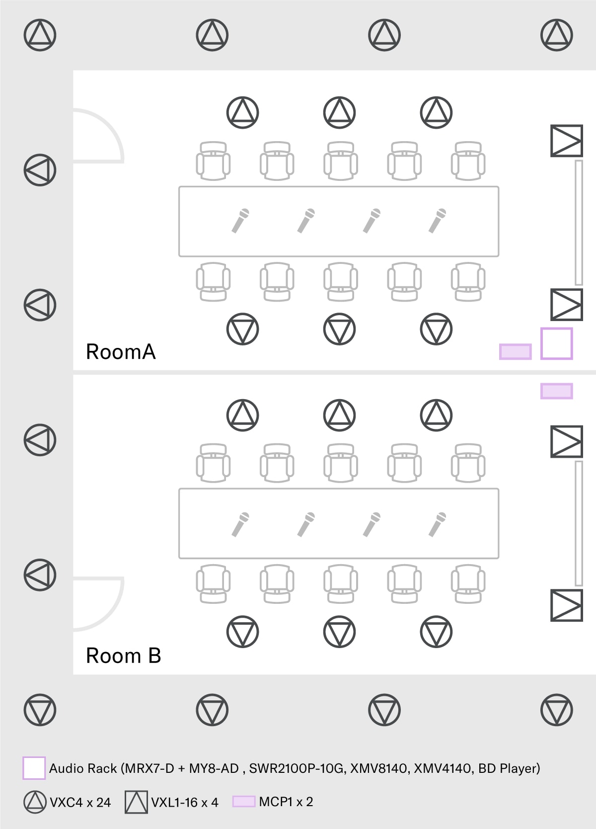 Quando duas salas de reunião adjacentes realizam conferências simultaneamente, pode surgir a preocupação de que conversas de uma sala sejam ouvidas na outra, distraindo os participantes. Este sistema utiliza a função de Speech Privacy para evitar que o conteúdo das conversas escape para o corredor. Ao mesmo tempo, ele também mascara o que é dito nas salas vizinhas, proporcionando um ambiente confortável onde cada grupo pode se concentrar apenas em sua própria reunião.