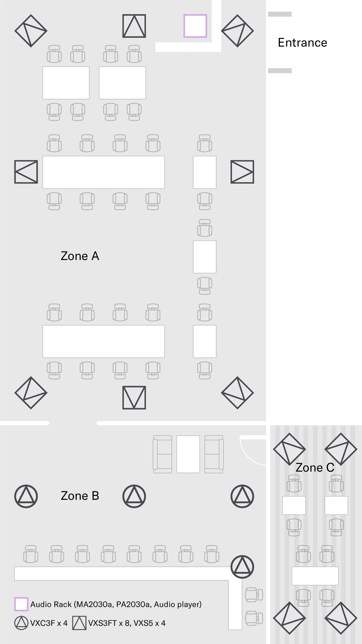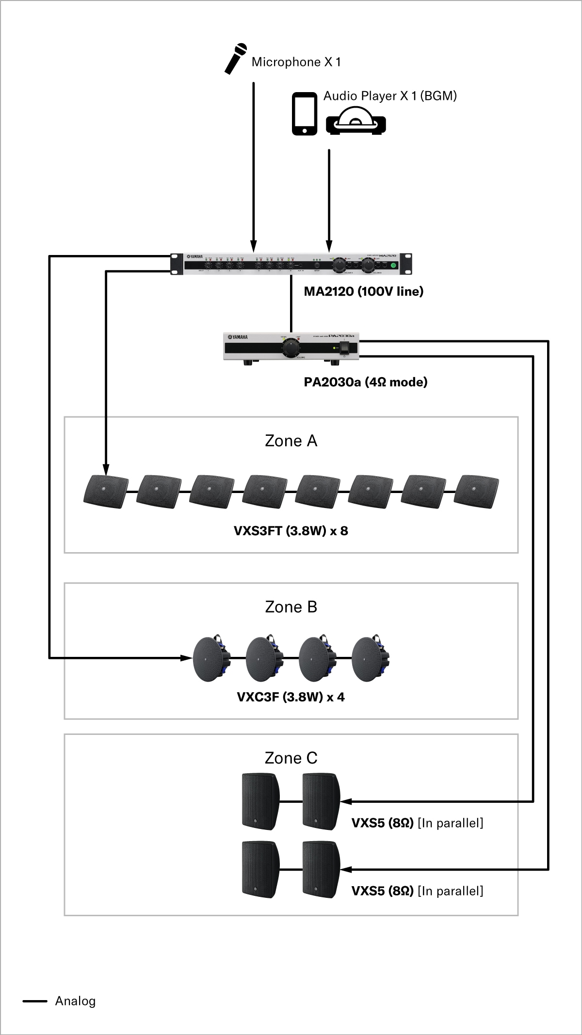 Para espaços que podem ser divididos em duas zonas, configurações de volume separadas podem ser ajustadas para cada zona desativando a função de sincronização de volume entre o amplificador de potência MA2030a e o amplificador de expansão PA2030a. Isso permite que os clientes ouçam música ambiente em um volume ideal tanto em ambientes silenciosos quanto em espaços com mais ruído ambiente, como um terraço.