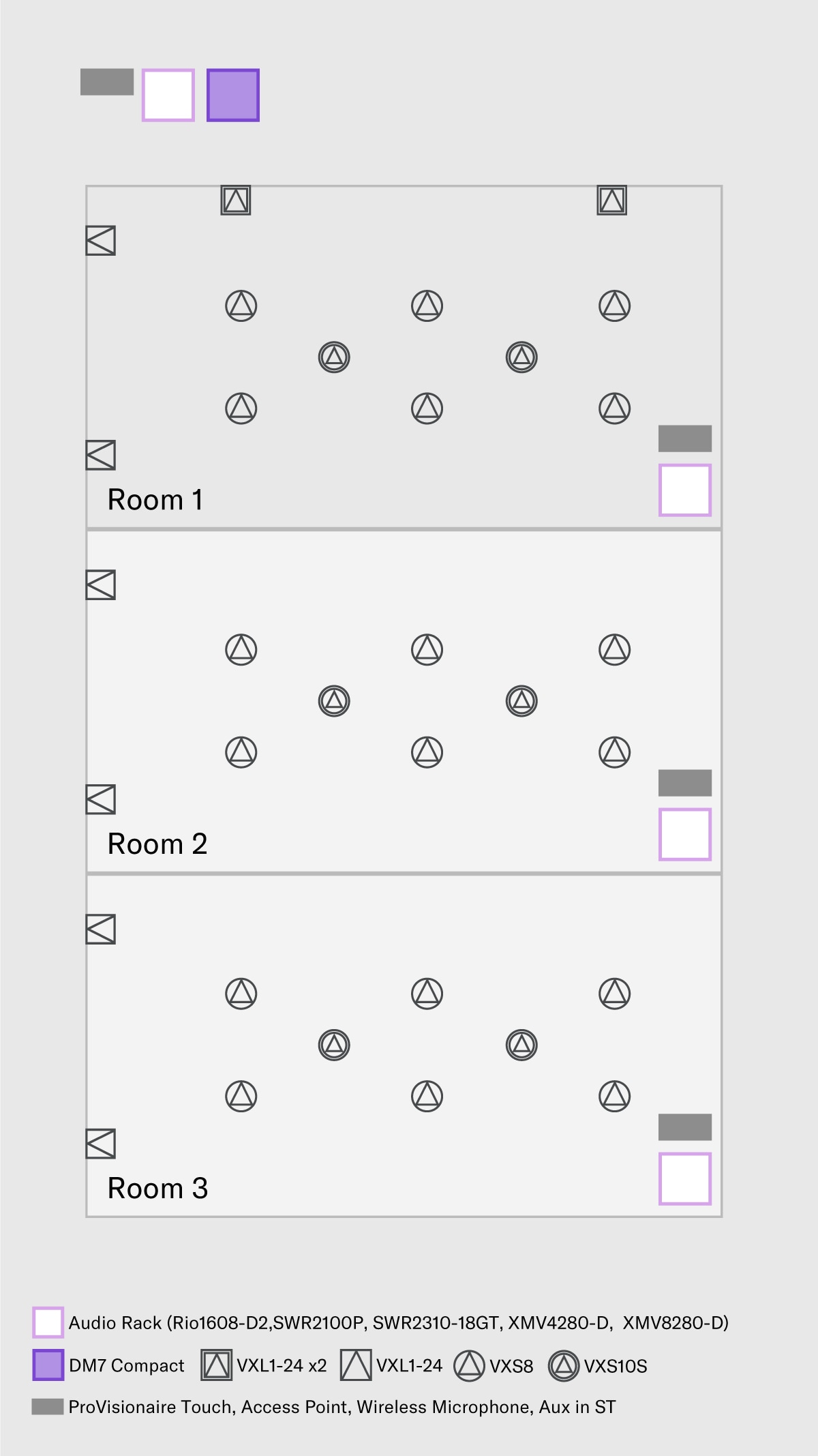 Cada sala neste exemplo é equipada com uma caixa acústica slim line array VXL1-24 para reproduzir dois sinais de microfone sem fio e áudio de PC, enquanto os VXS8s instalados no teto fornecem saída de som e clareza adicionais. Os subwoofers VXS10S também são montados no teto para fornecer desempenho ideal de baixa frequência a partir de fontes de reprodução de áudio. Os usuários podem controlar essa configuração simples convenientemente por meio do aplicativo de controle remoto para tablet ProVisionaire Touch.