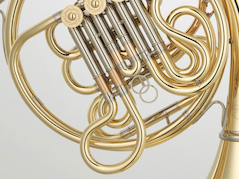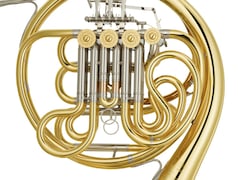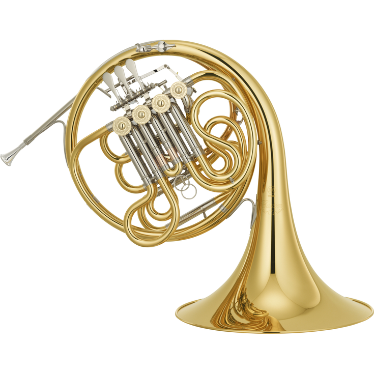 Trompa dupla completa da série Custom, afinação: Fá/Sib, Válvulas: 4 válvulas rotativas, tamanho da campana: M, Tipo de campana: removível, diâmetro: 12,1 mm (0,476"), camisa do pistão: prata níquel, rotores de válvula: Sólido (1ª, 2ª e 3ª), Oco (4ª), ação da alavanca: corda