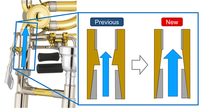 Os modelos anteriores incluíam uma saliência interna no receptor da corrediça que foi projetada para proporcionar uma ótima resistência ao toque e um timbre consistente. O YBL-835 elimina esse elemento de design, possibilitando um volume mais alto, um som potente e uma resposta de reprodução geralmente aprimorada.