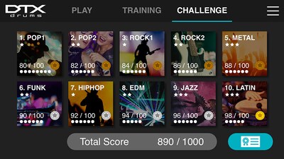 O “Challenge Mode” é uma nova função do DTX402 Touch que testa suas habilidades. Quem tocar todas as 10 músicas sem cometer um erro receberá um “Certificado de Baterista” da equipe de bateria da Yamaha DTX - você pode até compartilhar nas mídias sociais!