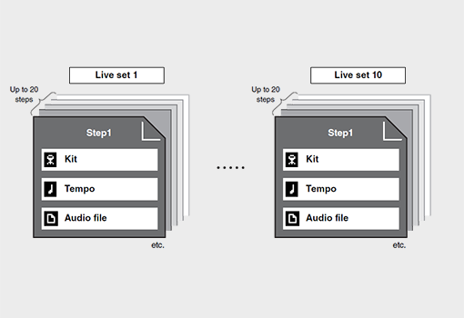 A nova função "Live Set" permite que você organize e configure livremente várias combinações de kits, tempos e arquivos de áudio e trilhas de apoio, e recupere-os com um único toque. Você também pode criar várias configurações de metrônomo para acomodar diferentes necessidades.