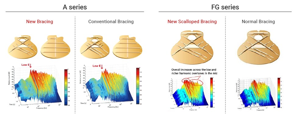 No desenvolvimento dos violões das novas séries L, FG, A Series e CSF, utilizamos uma combinação de medidas simuladas e reais, juntamente com muitos testes de audição, para determinar o som, e portanto a construção, de cada violão.
