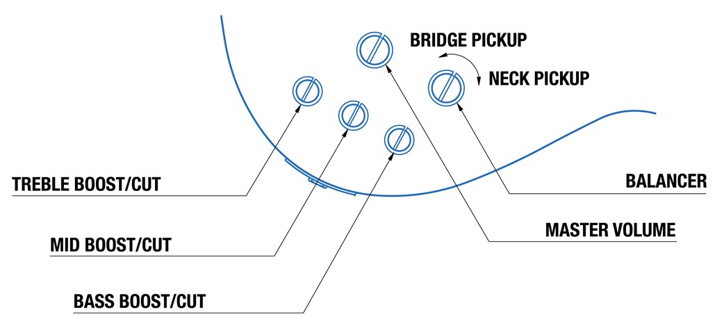 | Controles | Volume principal, balance do captador, equalizador de 3 bandas (graves, médios, agudos) | ||