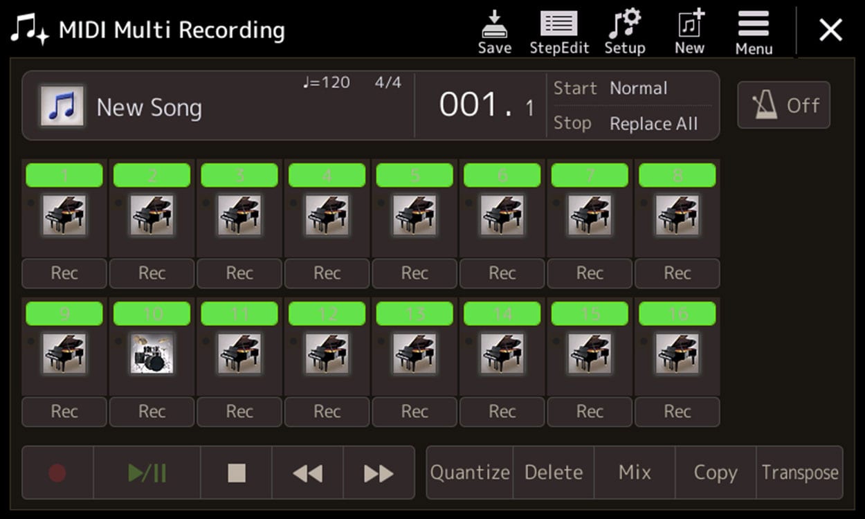 Com a função Quick Recording é muito simples gravar uma atuação ou ensaio em áudio (WAV) ou num ficheiro Standard MIDI File (SMF). Para composições mais complexas, o Multi Recording dispõe de um sequenciador MIDI de 16 pistas que possibilita a gravação em tempo real ou passo-a-passo.