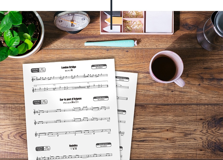 A partitura das músicas integradas está disponível gratuitamente em Song Book. Use com as funções de lição para aprender os padrões mais conhecidos do mundo e tocar acordes com rapidez, mesmo sem ter experiência no teclado.