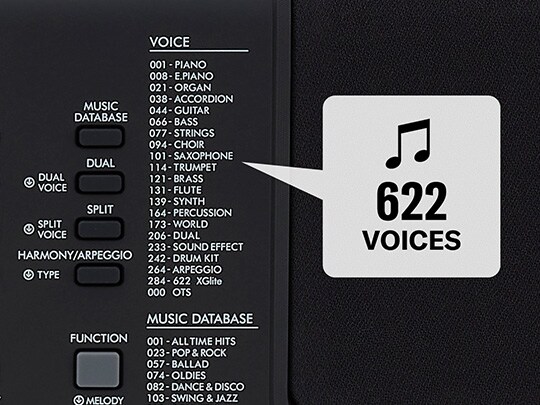 O PSR-E373 vem com o mais recente gerador de tons LSI da Yamaha, oferecendo a melhor qualidade de som já oferecida num instrumento desse tipo. São 622 Sons impressionantes, incluindo guitarra, baixo, cordas, sax, trompete, bateria e percussão, bem como piano, órgão e outros instrumentos clássicos de teclas; juntos, eles formam uma abrangente biblioteca de sons musicais. Você pode até mesmo sobrepor dois sons diferentes em todo o teclado com o “Dual Voice” para enriquecer ainda mais as apresentações!