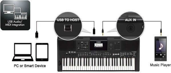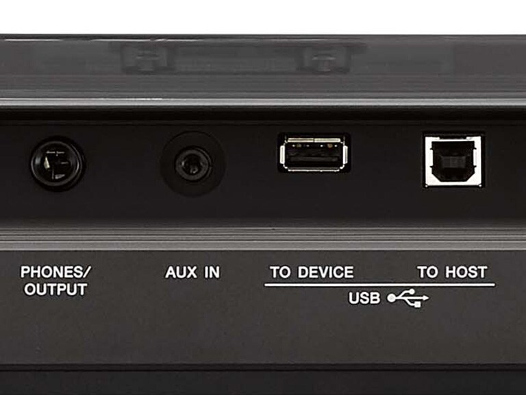 Conecte um player de áudio externo na entrada AUX IN e você poderá tocar junto com suas músicas favoritas. O Melody Supressor avançado e integrado abaixa o volume das linhas vocais e de melodia das gravações originais, deixando essa parte aberta para que você possa tocar ou cantar. **