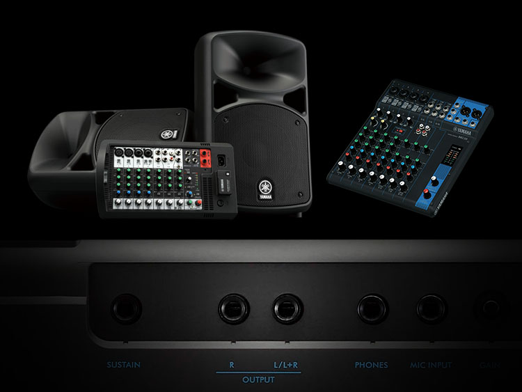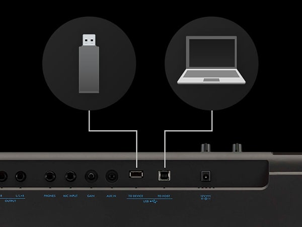 Uma variedade de opções de conectividade fornecem todo o apoio que você precisa para praticar, tocar e atuar. Ligue um microfone para experimentar cantar enquanto toca, use o aplicativo Rec'n'Share para compartilhar música com o mundo, e conecte a sistemas PA para atuar no palco.