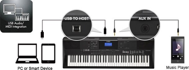 Ligue um leitor áudio externo ao jack AUX e poderá tocar a acompanhar as suas músicas favoritas. O avançado Melody Supressor integrado reduz o volume de linhas vocais e melódicas às gravações originais, deixando esse espaço aberto para o seu improviso**.