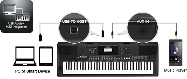 O PSR-EW410 permite a transferência de áudio através do terminal USB TO HOST*. Você pode gravar suas performances no seu computador ou dispositivo smart.