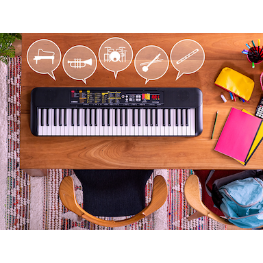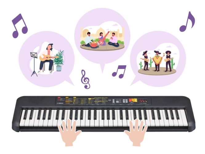 Não são só os pianos, as guitarras ou os instrumentos de sopro; o Yamaha PSR-F52 vem equipado com os sons dos instrumentos (Voices) essenciais para tocar música dos quatro cantos do mundo. A função de estilo de acompanhamento automático (Style) proporciona a diversão de tocar com uma banda virtual e apresenta uma variedade de estilos não só de gêneros standard como o rock ou o jazz, mas também gêneros que captam a essência da música de diferentes países.