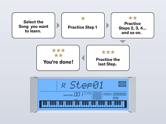 Use as funções de aprendizado para se divertir tocando com facilidade as músicas integradas. Com essas convenientes funções de aprendizado, você pratica as músicas integradas e melhora suas técnicas musicais. As funções de aprendizado são organizadas para uma aprendizagem perfeita e agradável; basta selecionar a mais adequada para você e aprimorar suas habilidades no teclado.
