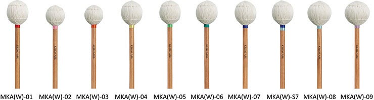 [MKA(W)-02/03] Os modelos MKA(W)-02 e MKA(W)-03 utilizam cabos curtos para execução rápida e detalhada com baquetas. Difícil perceber apenas olhando, mas o peso adicional nas cabeças das baquetas oferece ao percussionista maiores possibilidades de execução.