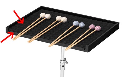 O uretano corta-ondas no tampo da mesa evita que as baquetas rolem.