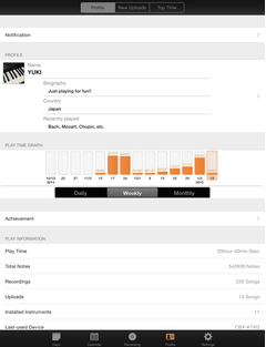 A parte do “diário” do Piano Diary anota com que frequência você ensaia, quanto dura seu ensaio e até quantas notas você toca. Você pode comparar suas seções de ensaio com a de outros usuários do Piano Diary. Se você tocar mais, você será recompensado pelo Piano Diary que irá destravar novos sons para que você experimente.