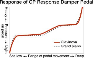 O pedal de sustentação é um elemento importante na execução do piano porque varia continuamente o som à medida que é pressionado. O Clavinova proporciona comportamento de piano acústico ao detectar constantemente a quantidade de movimento do pedal e ajustando minuciosamente a quantidade de alongamento e reverberação da nota. Para além disso, o pedal GP reproduz a sensação típica dos pianos de cauda, como por exemplo menos resistência quando se começa a pressionar e uma sensação pesada quando o pedal começa a sortir efeito. Como resultado, os músicos alcançam maior controlo quando operam o pedal.
