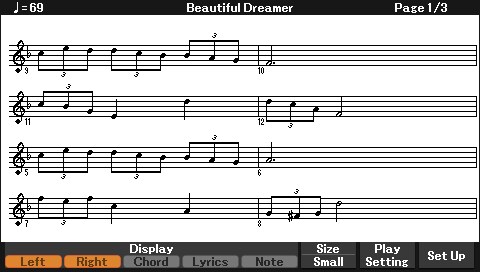 Com a partitura no visor, os recursos de lições internas (Lesson) são uma forma divertida de aprender e dominar as Músicas. Quando você pratica a mão direita, por exemplo, a parte esquerda e outras partes esperam você tocar as notas corretamente. Assim, você pratica as melodias e frases mesmo se for iniciante.