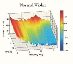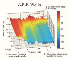 O gráfico mostra como o tratamento A.R.E. produz as alterações características mostradas abaixo. 1.Melhorar o volume e a sustentação da faixa baixa oferece um timbre fundamental mais forte com melhor projeção. 2.A resposta aprimorada da faixa média proporciona um tom mais intenso e uma potência mais expressiva. 3. A dissonância de alta faixa tem um declínio mais curto, melhorando a resposta e a articulação do instrumento. Nossa equipe de pesquisa, que tem muitos anos de experiência estudando madeiras para instrumentos, iniciou o projeto A.R.E na década de 1990 visando usar essa tecnologia em nossos violinos. Antes de ser usado no violino, ele foi utilizado primeiro em violões e em materiais de fabricação acústica usados em salas de concerto, onde foi comprovado que ele oferece melhorias significativas na performance do produto. Estamos satisfeitos por podermos agora usar essa tecnologia no instrumento para o qual ela foi originalmente projetada e temos muito orgulho em apresentar o YVN500S, o carro-chefe da série Artida.