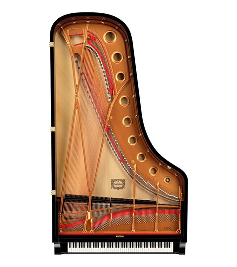 Usamos o melhor spruce europeu na tábua harmônica, considerada o coração do piano pelo papel dela na transmissão das vibrações das cordas por todo o piano. A forma da coroa foi refinada para melhorar a eficiência das vibrações e gerar um som médio-grave mais profundo, rico e ressonante. A largura e a altura das costelas da tábua harmônica foram modificadas para aumentar o alcance dinâmico.