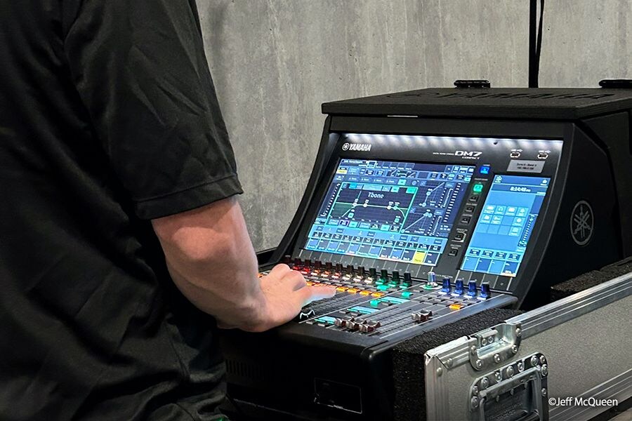 A complexidade do evento exigiu um sistema flexível e absolutamente confiável. A infraestrutura da Yamaha com suporte a Dante serviu como espinha dorsal do sistema, com 11 consoles distribuídos pelo espaço, incluindo (2) DM7-EX, (4) DM7-C e (5) DM3. Cada um atuando como ponto de mixagem local e hub de entrada/saída.