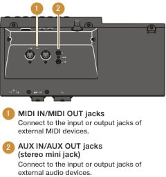 - Os terminais AUX e MIDI permitem que o som seja emitido em uma variedade de dispositivos externos (p. ex., componentes estéreo, gravadores CI, alto-falantes com amplificadores integrados e sistemas estéreo).
