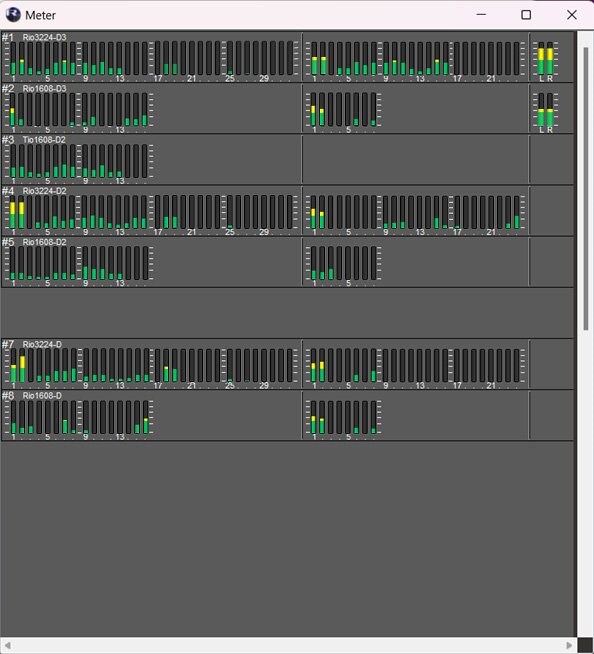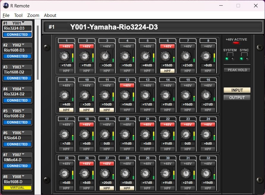 O R Remote é um aplicativo de software que permite a edição remota abrangente dos parâmetros do Rio3224-D3 e do Rio1608-D3, bem como de outros racks de E/S da série R da Yamaha. Com o R Remote, a edição de parâmetros do pré-amplificador de rack de E/S que geralmente exigiria um console com capacidade remota, como o RIVAGE PM e a série DM7, pode ser realizada diretamente de um computador. Isso pode ser especialmente conveniente em sistemas que não possuem um console.