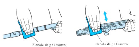 Sempre que terminar de tocar, seque-o com uma flanela macia, inclusive na parte interna utilizando a vareta de afinação e limpeza. Esta vareta normalmente acompanha o instrumento e tem duas funções; ajustar a afinação e servir de haste de fixação da flanela facilitando a limpeza interna.